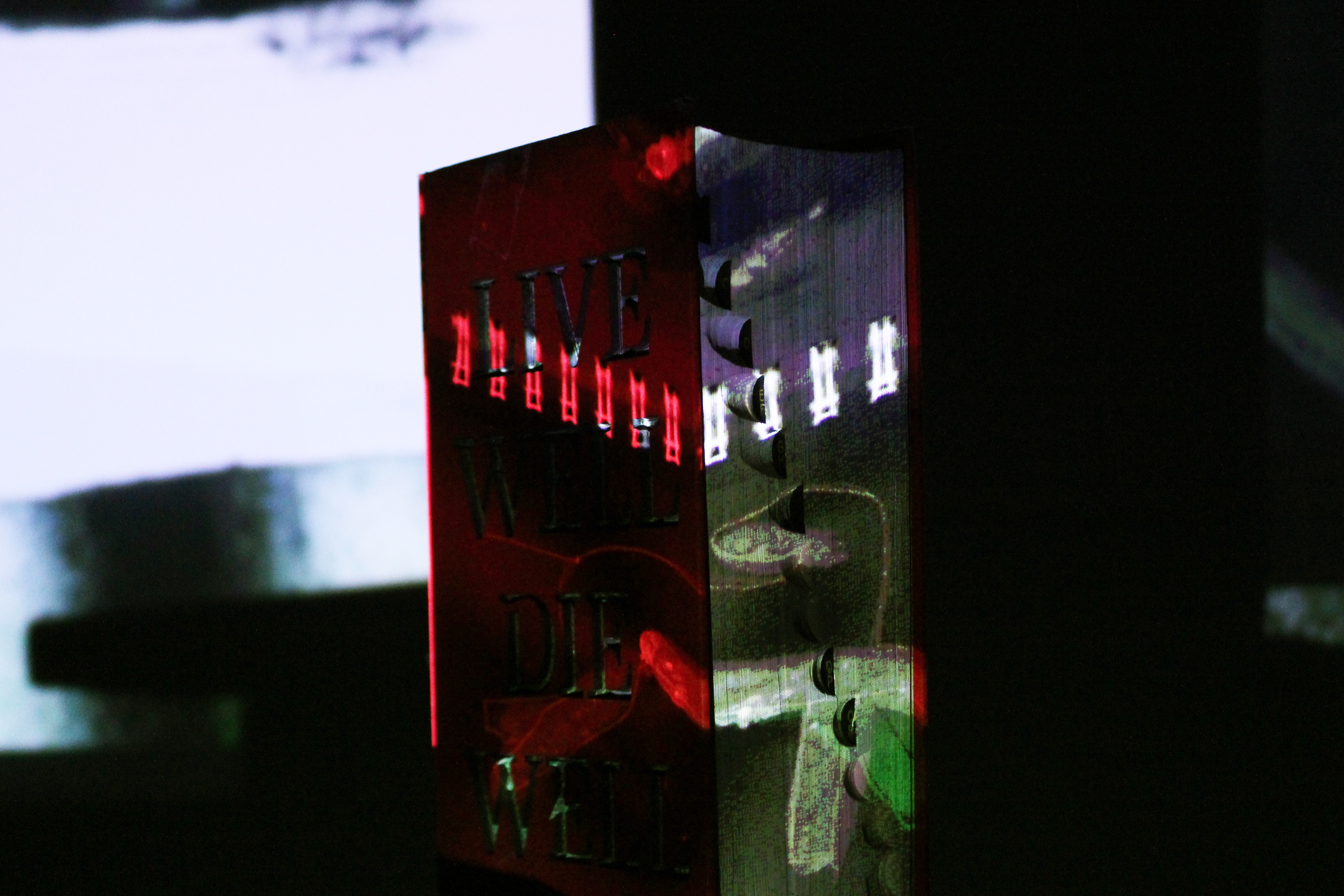 Live Well Die Well is a video and sculptural installation motivated by my grandmother's last advice before she passed away. She was a woman with momentum, strength, and beauty. During her final weeks, I couldn't help myself from drawing a horse galloping, viewing videos of them, and listening to bands like the Flamingos. They gave me a sense of serenity. I laser cut through a dictionary her advice she gave me. There is something unconstitutional in defacing a book. Similar to losing the person we cherish most feels criminal. Song - Flamingos, I Only Have Eyes for You